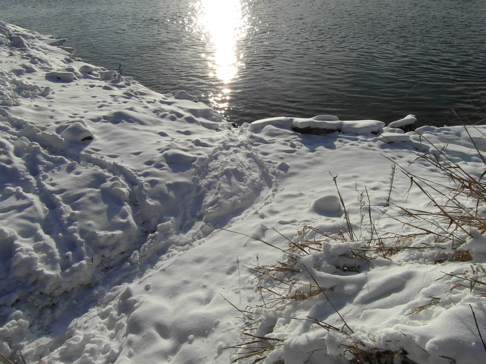 Spaceruję sobie brzegiem rzeki zachwycając się czystością świeżego śniegu.